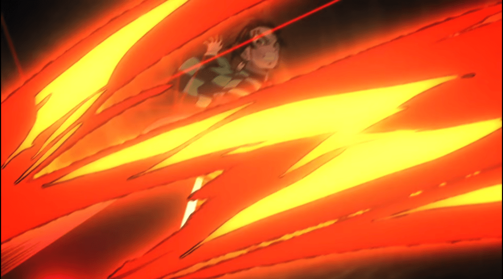 Time to stop beating around the bush. This scene is gorgeous. Why? Because I mean look at it. The fire effect absolutely illuminates the screen. All of the expressions on Tanjiro (The main character with the scar on his forehead.) showcase his drive to survive and protect his sister as he fights for his life. The excellent use of blurred lines and focus changes to convey fast action and motion. (A point I will delve deeper in when I write about the flow of the scene.) The way all of the sparks light up the the otherwise dark forest they’re currently in. Plus no part in this scene feels wasted. Every single frame was crafted into a beautiful collage of images.